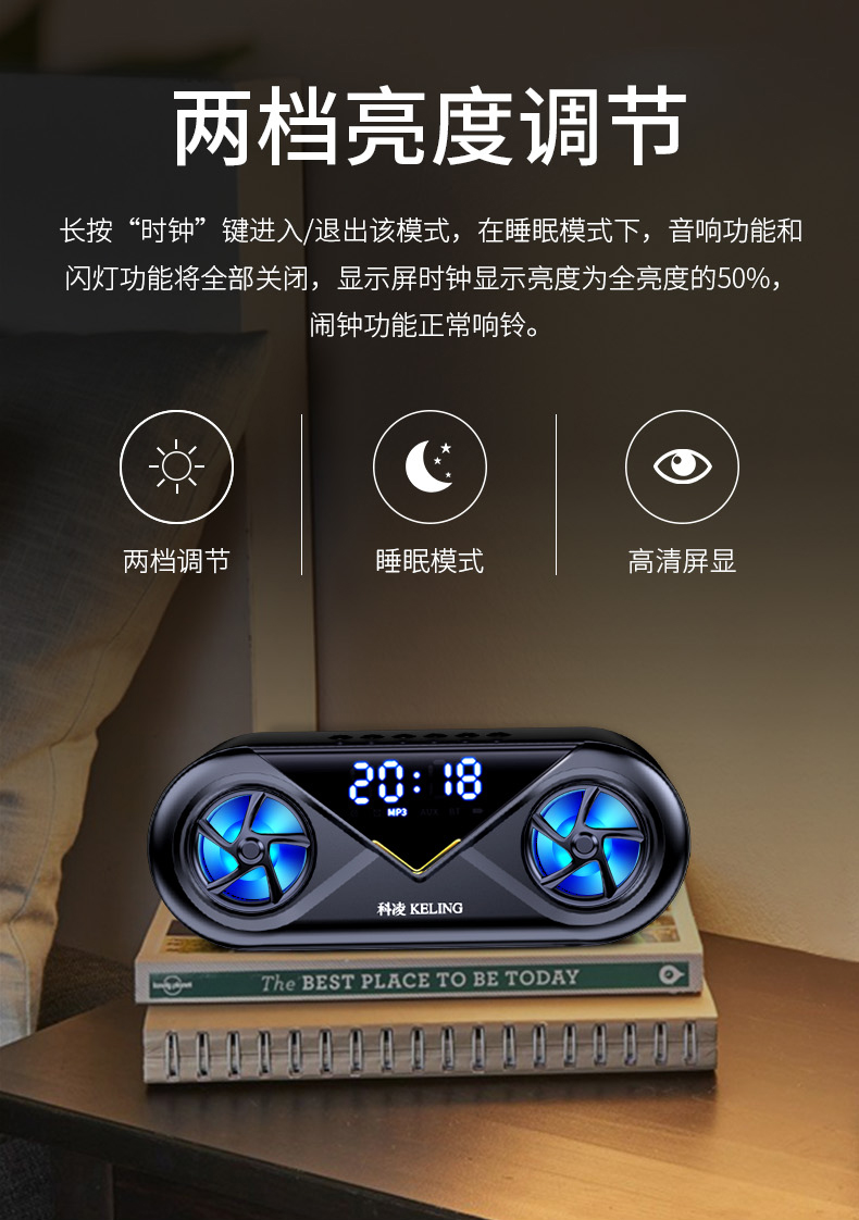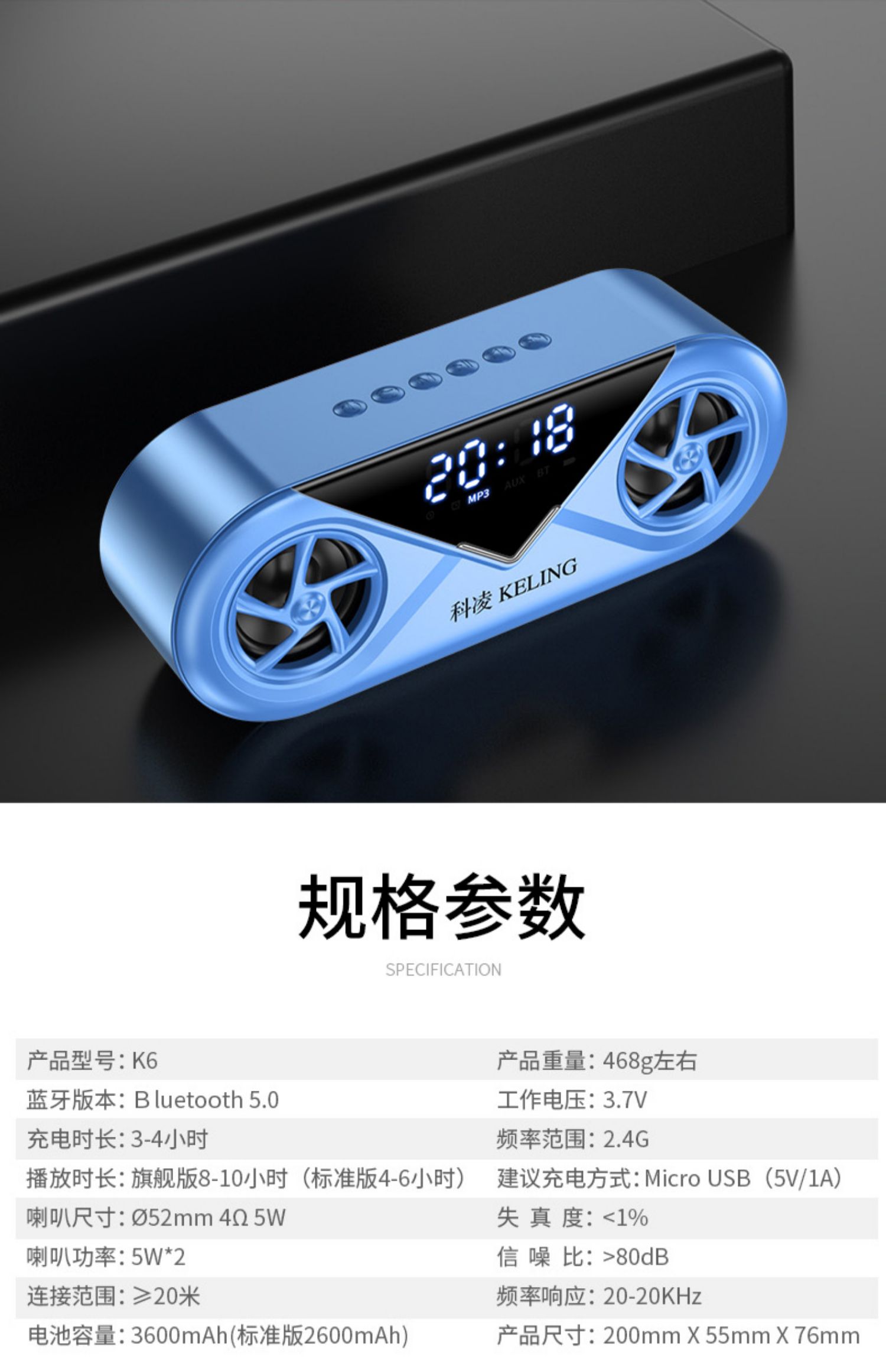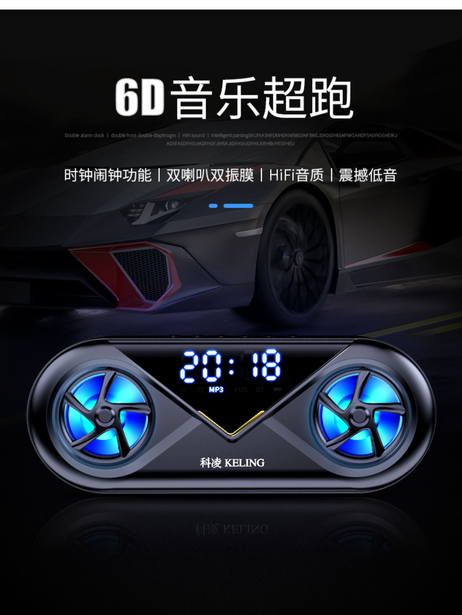 • 商品名称:科凌无线蓝牙音箱双喇叭大音量3D环绕家用闹钟小型迷你音响手机超重低音炮便携式户外车载收款收钱语音播报器