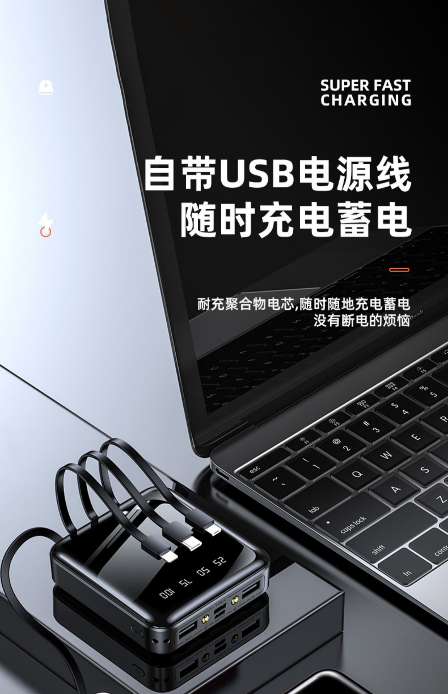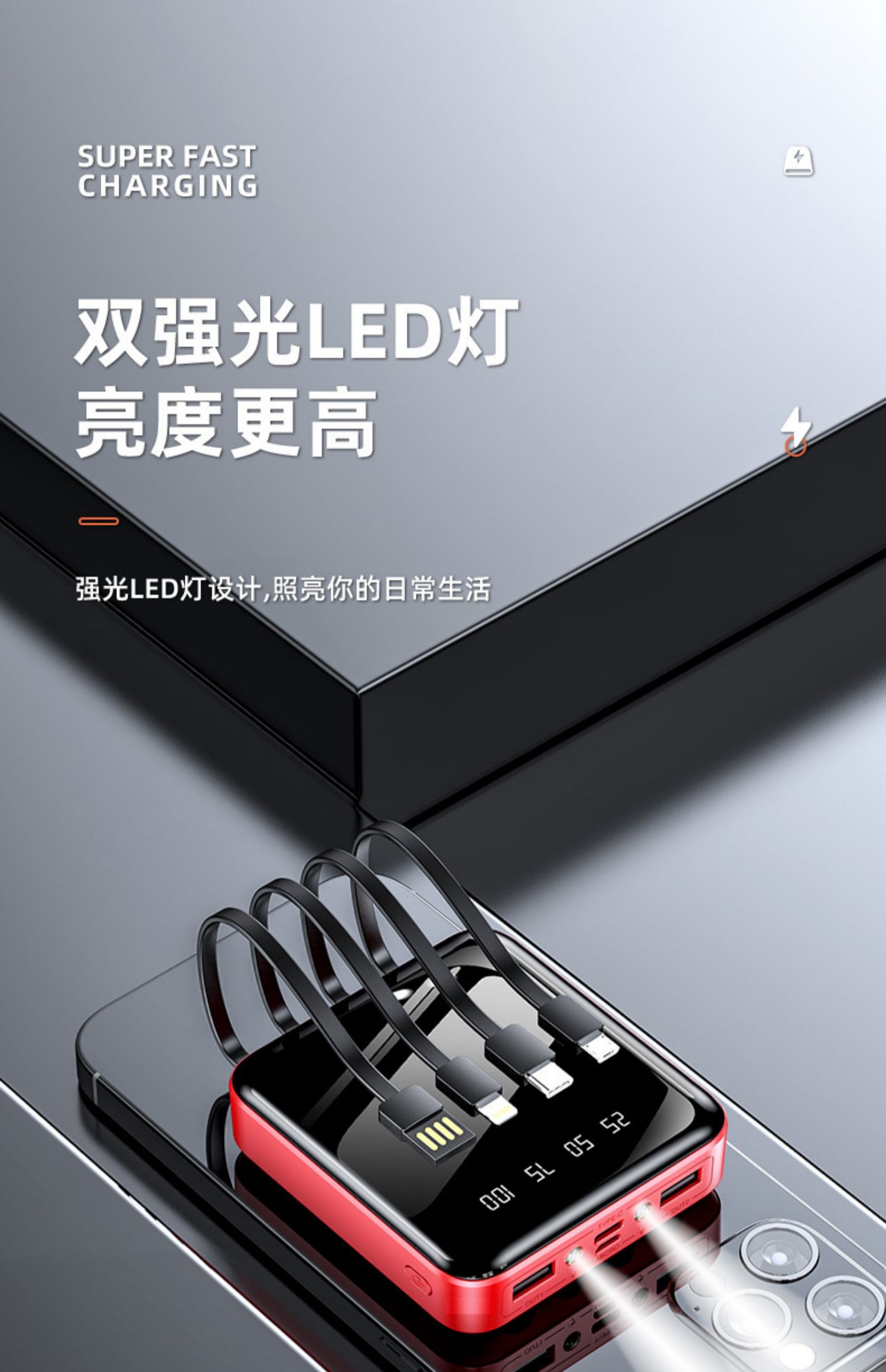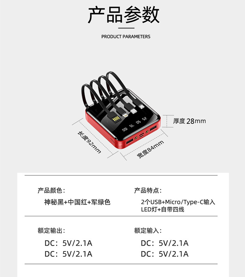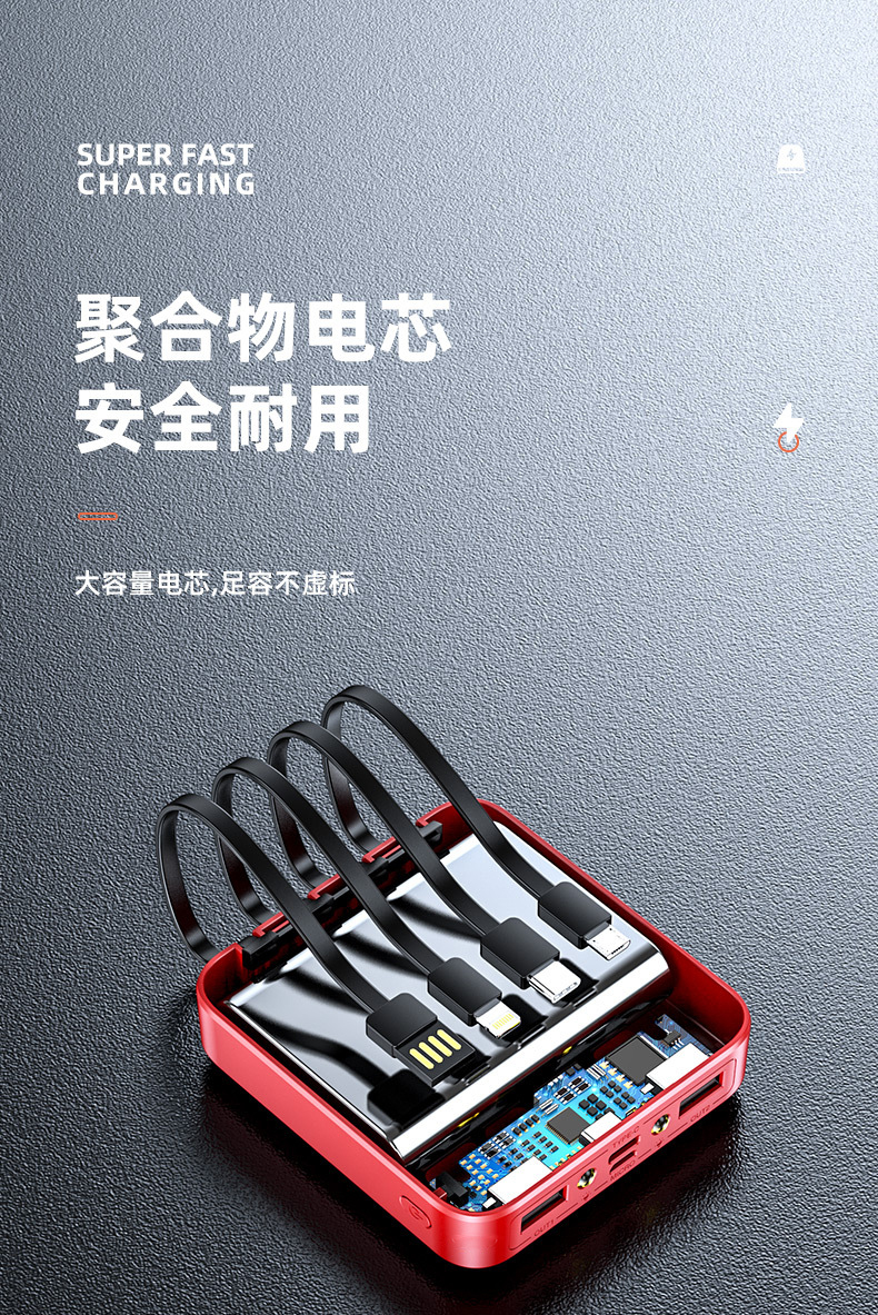 • 商品名称:充电宝20000m超薄小巧便携大容量薄迷你快充手机自带线2万毫安适用华为苹果oppo手机专用1000000M超大量官方