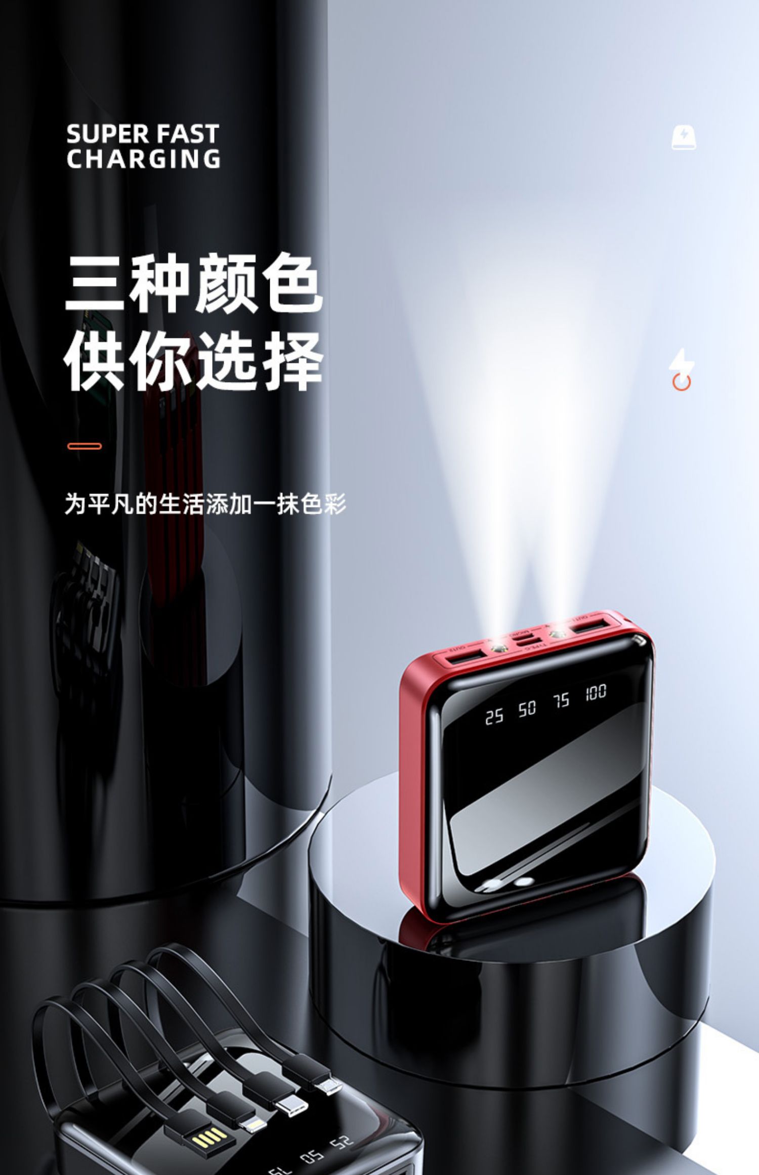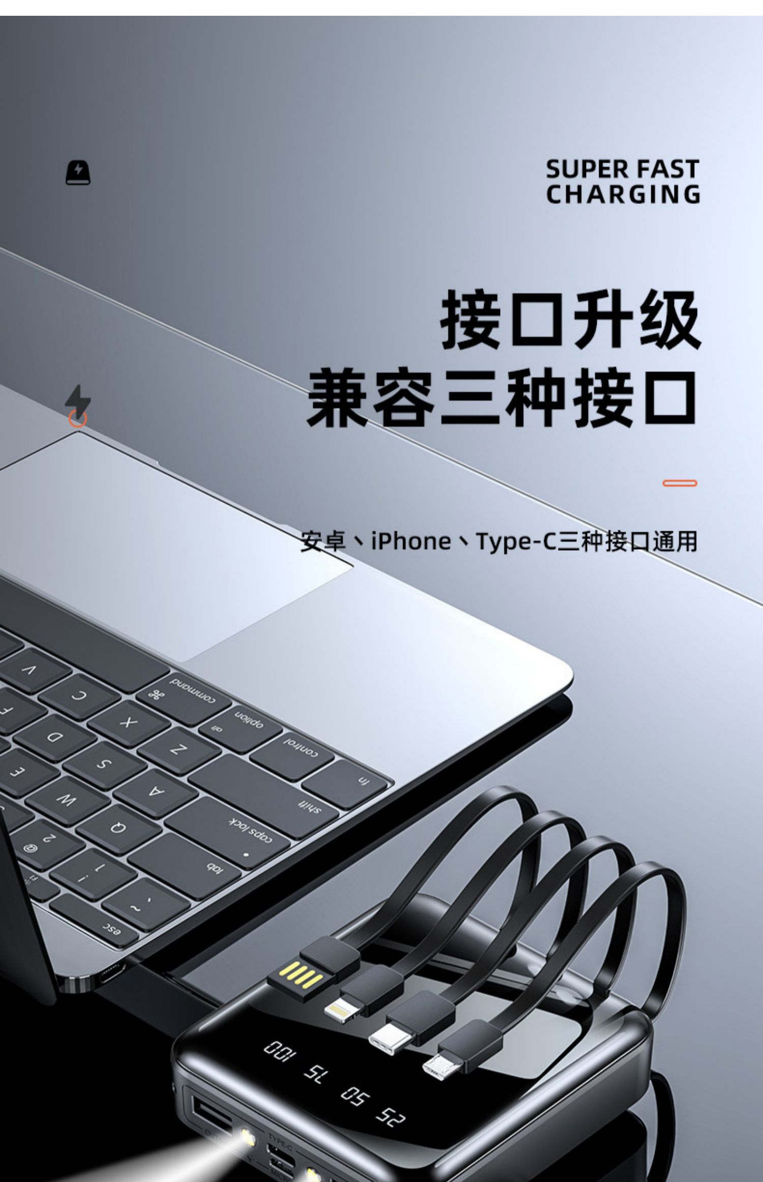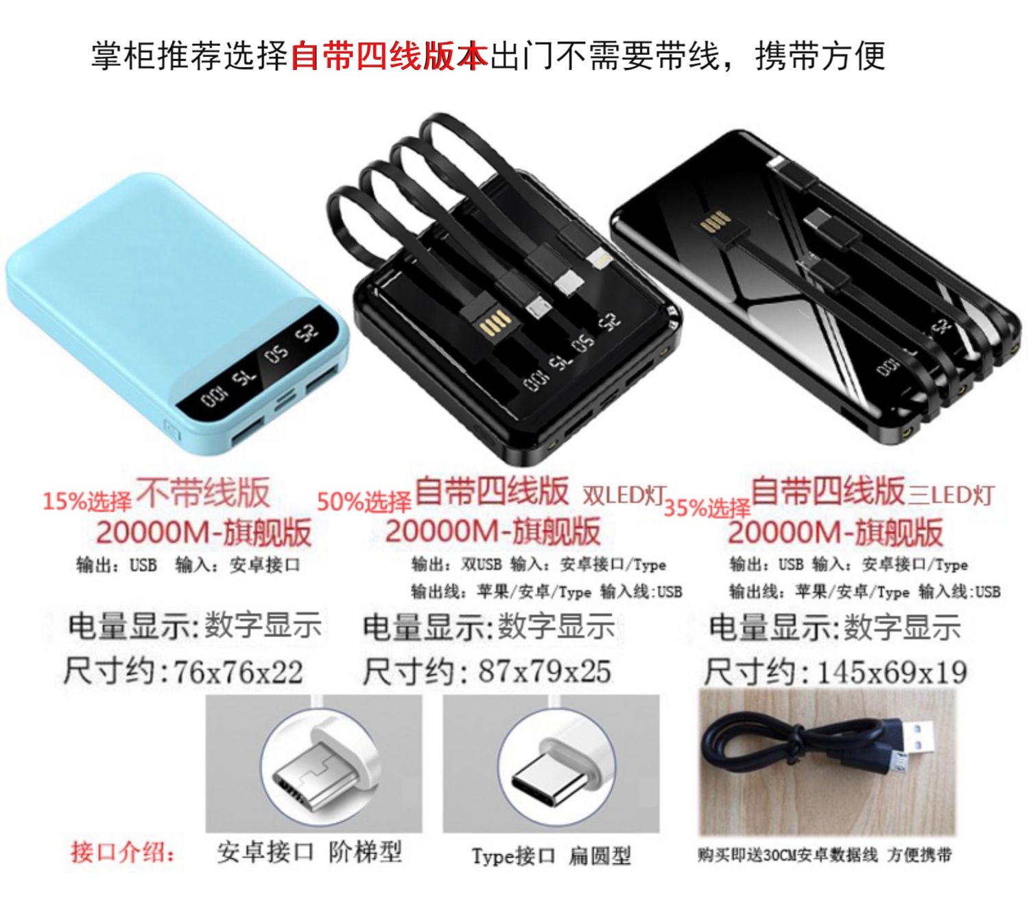 • 商品名称:充电宝20000m超薄小巧便携大容量薄迷你快充手机自带线2万毫安适用华为苹果oppo手机专用1000000M超大量官方