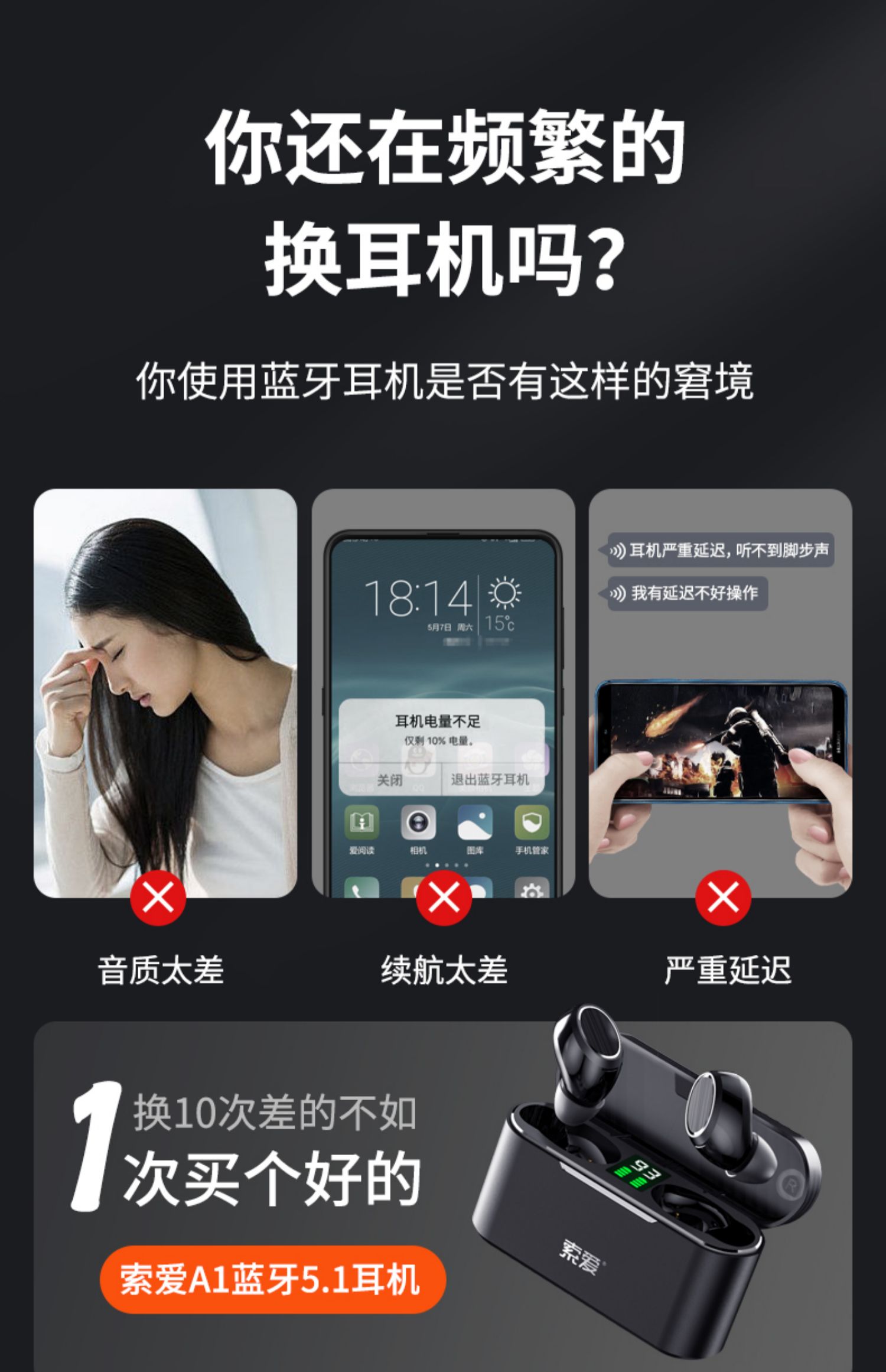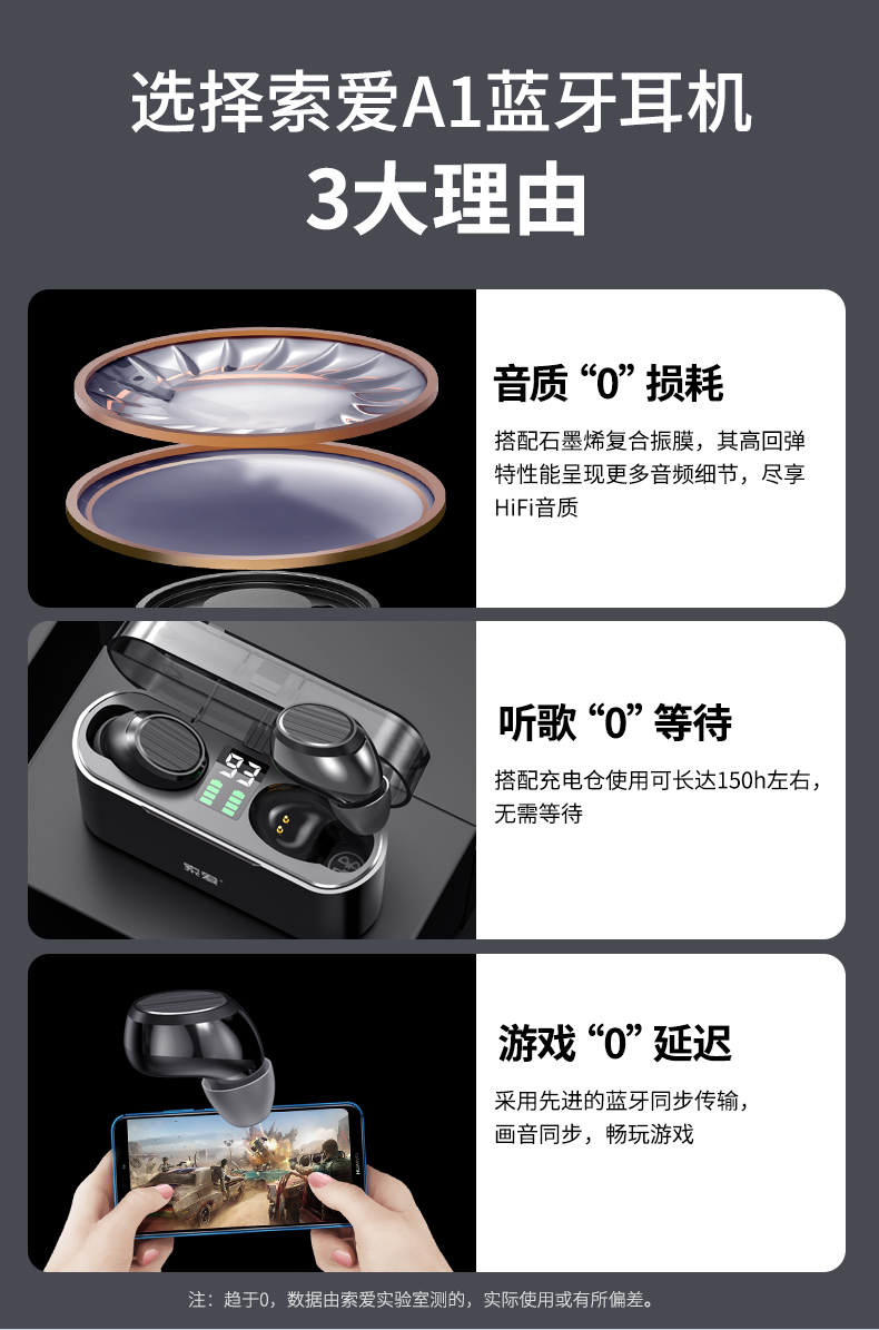 • 商品名称:【陈小春推荐】索爱A1 真无线蓝牙耳机2021年新款入耳式降噪运动音质超好超长续航高端男女款适用于华为苹果
