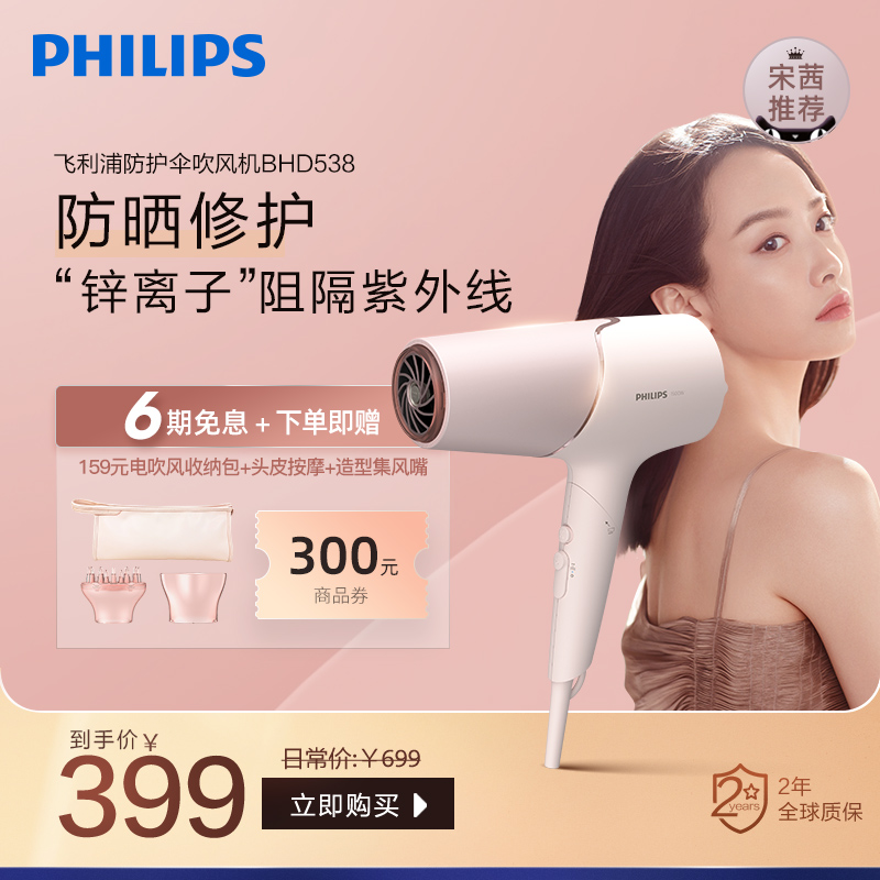 飞利浦防晒护发电吹风机 家用负离子护发大功率速干吹风筒BHD538