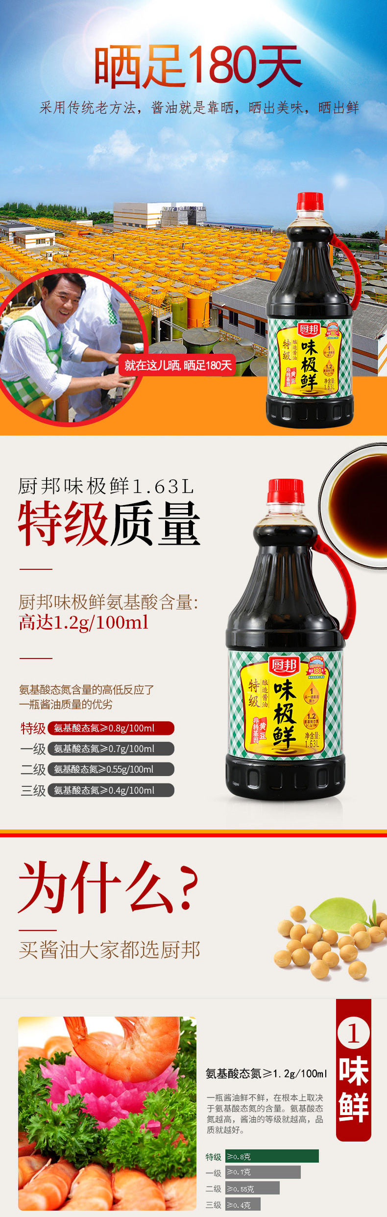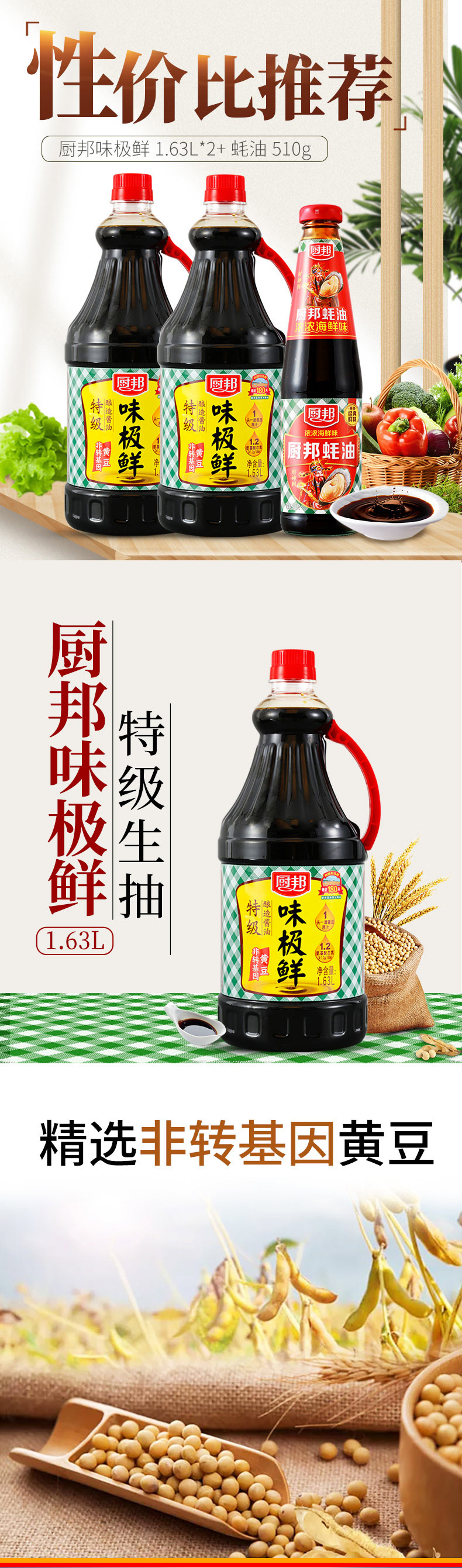 • 商品名称:厨邦酱油味极鲜1.63L*2+510g蚝油 特级生抽蒸鱼豉油美味鲜大桶装