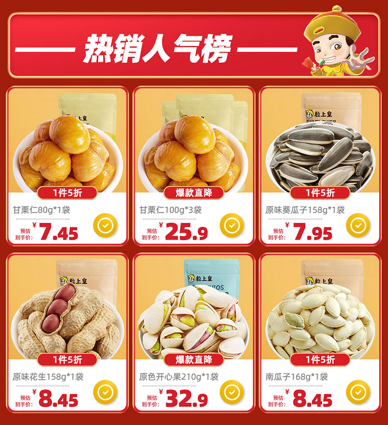 • 商品名称:【包邮】粒上皇甘栗仁毛板栗子100g*3袋坚果炒货休闲零食即食特产