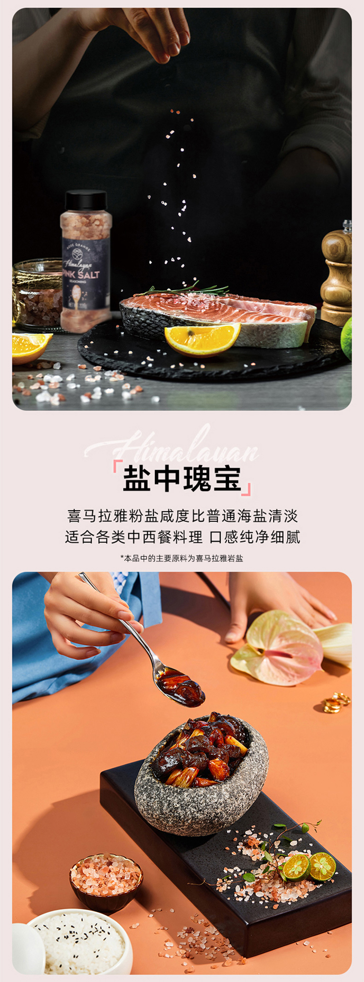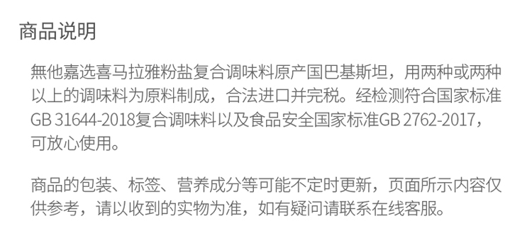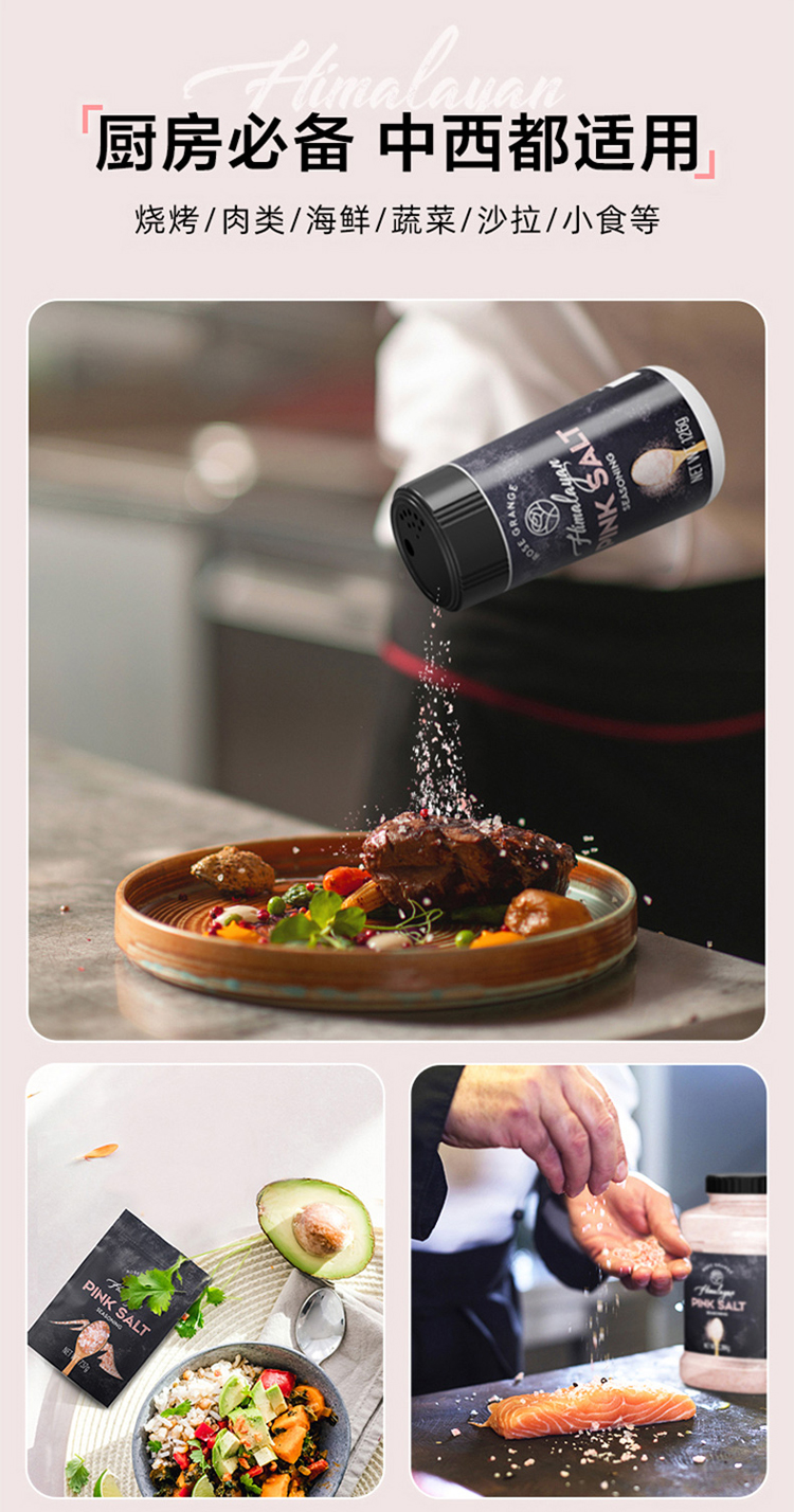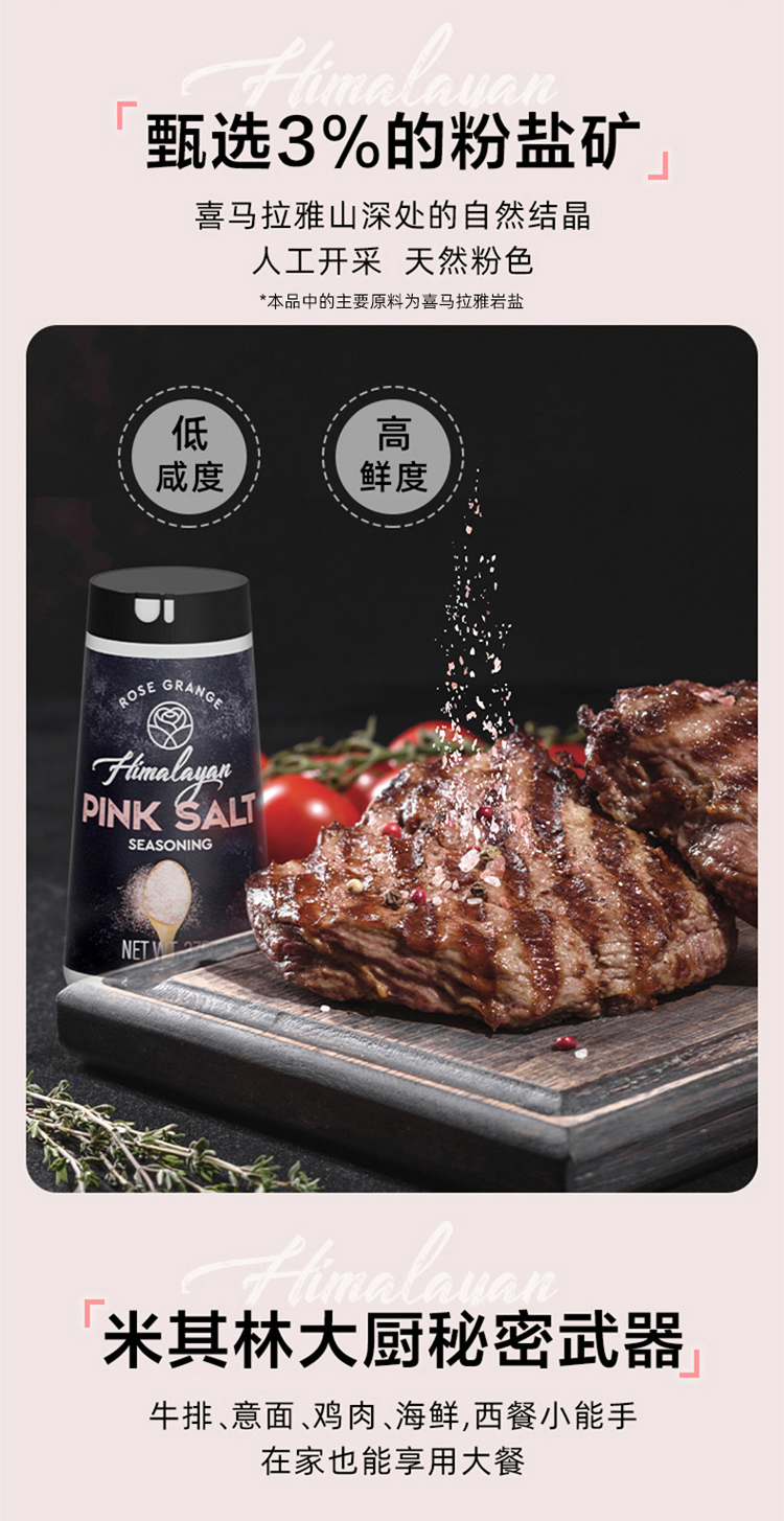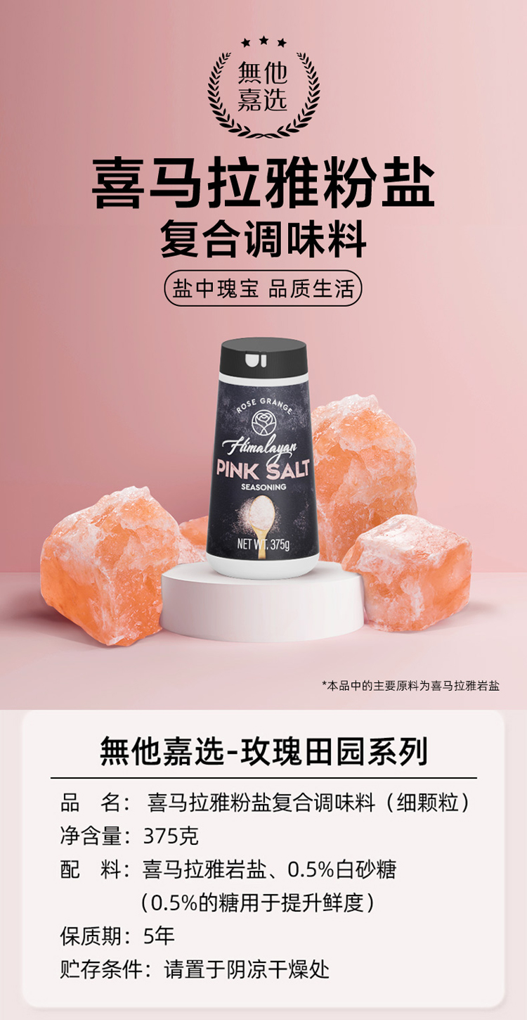 • 商品名称:无他嘉选 进口喜马拉雅粉盐玫瑰盐细盐未加碘复合牛排调味料375g