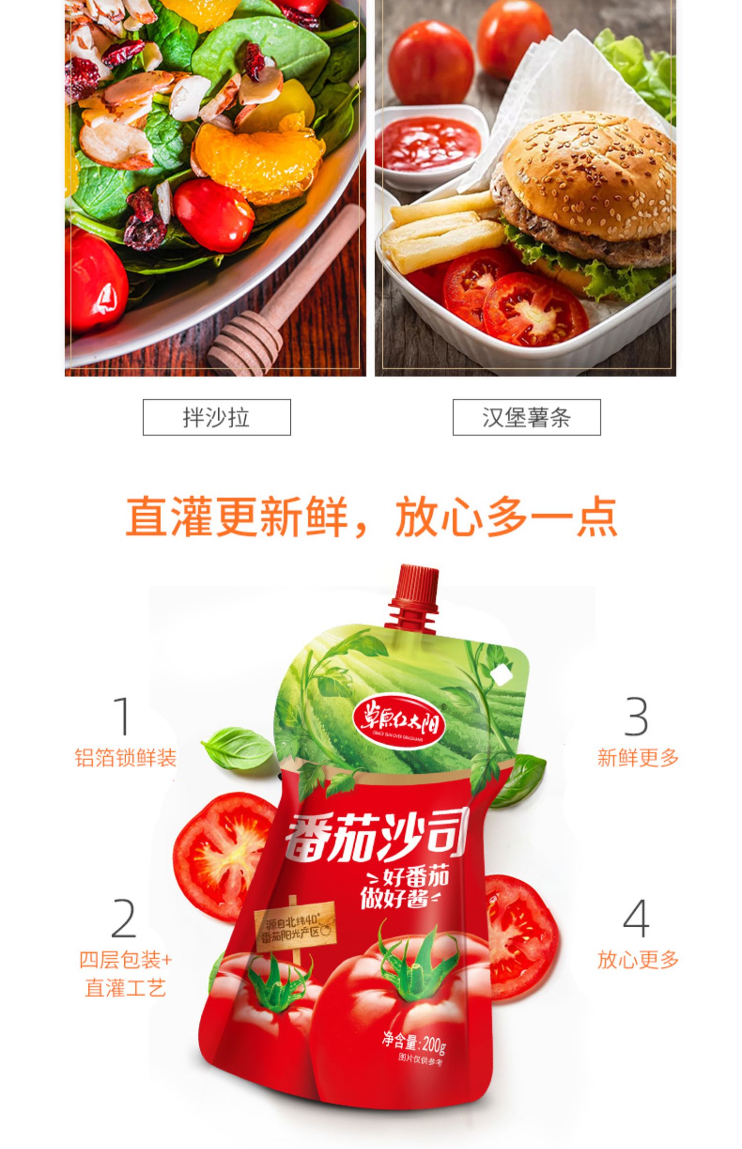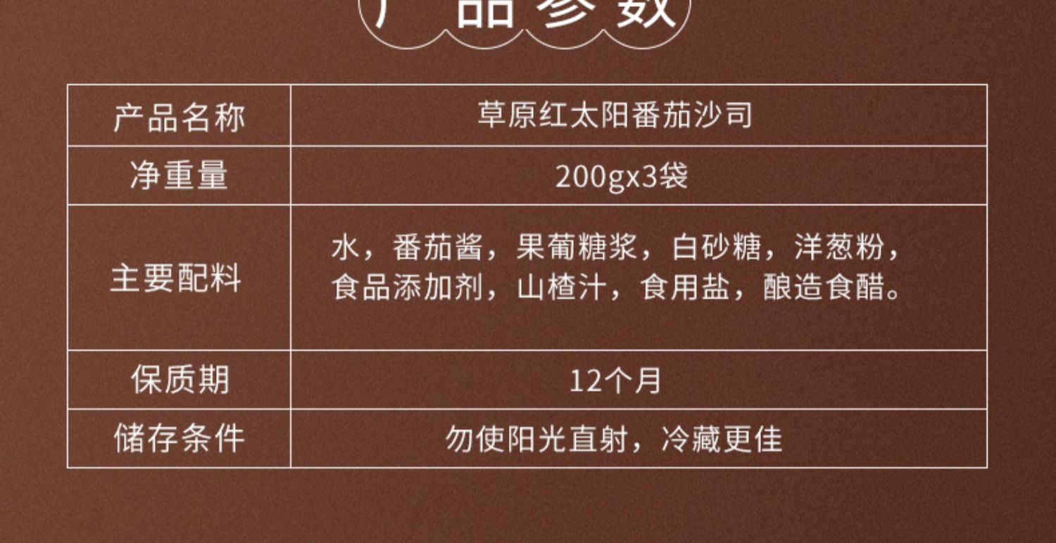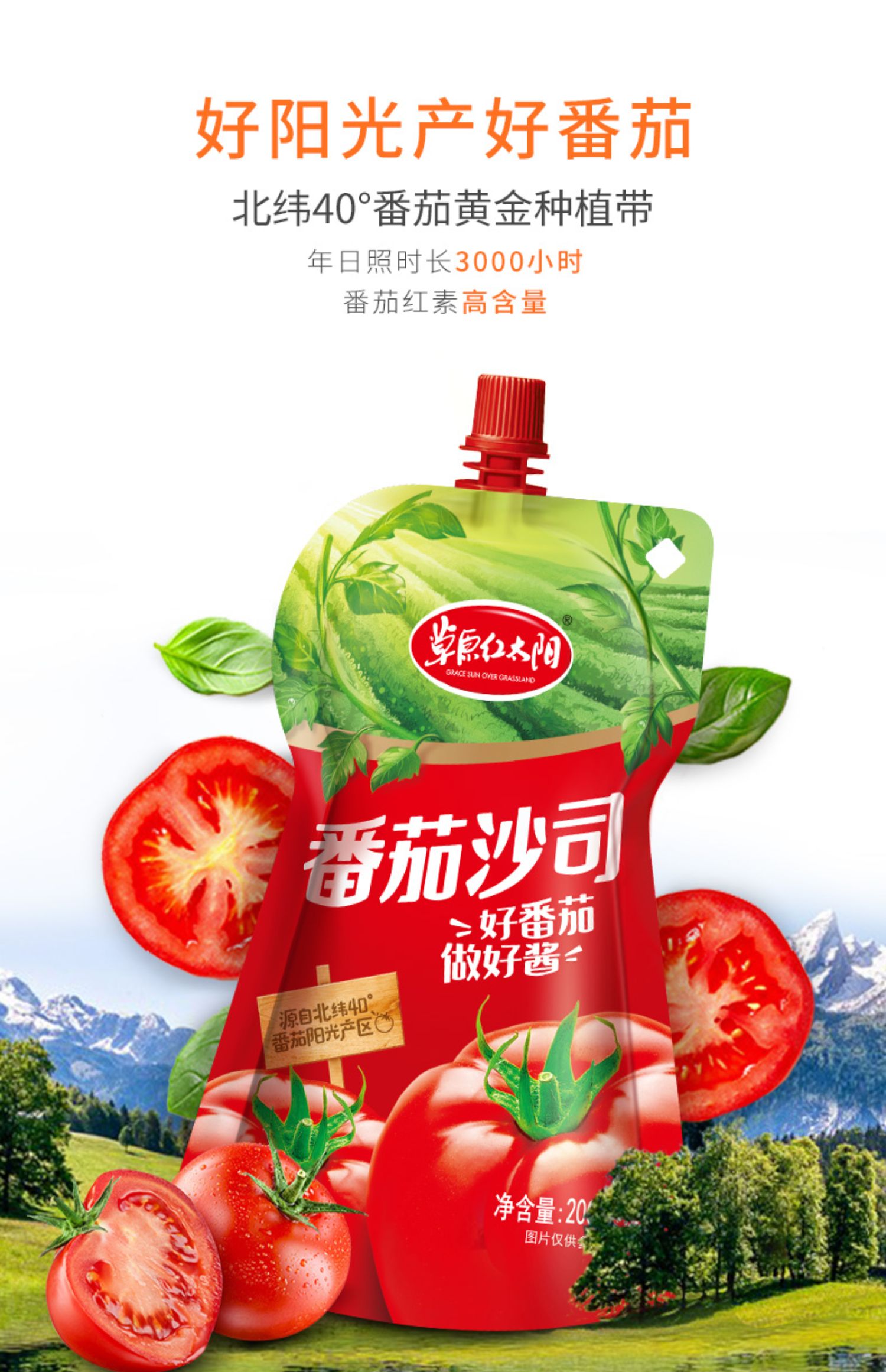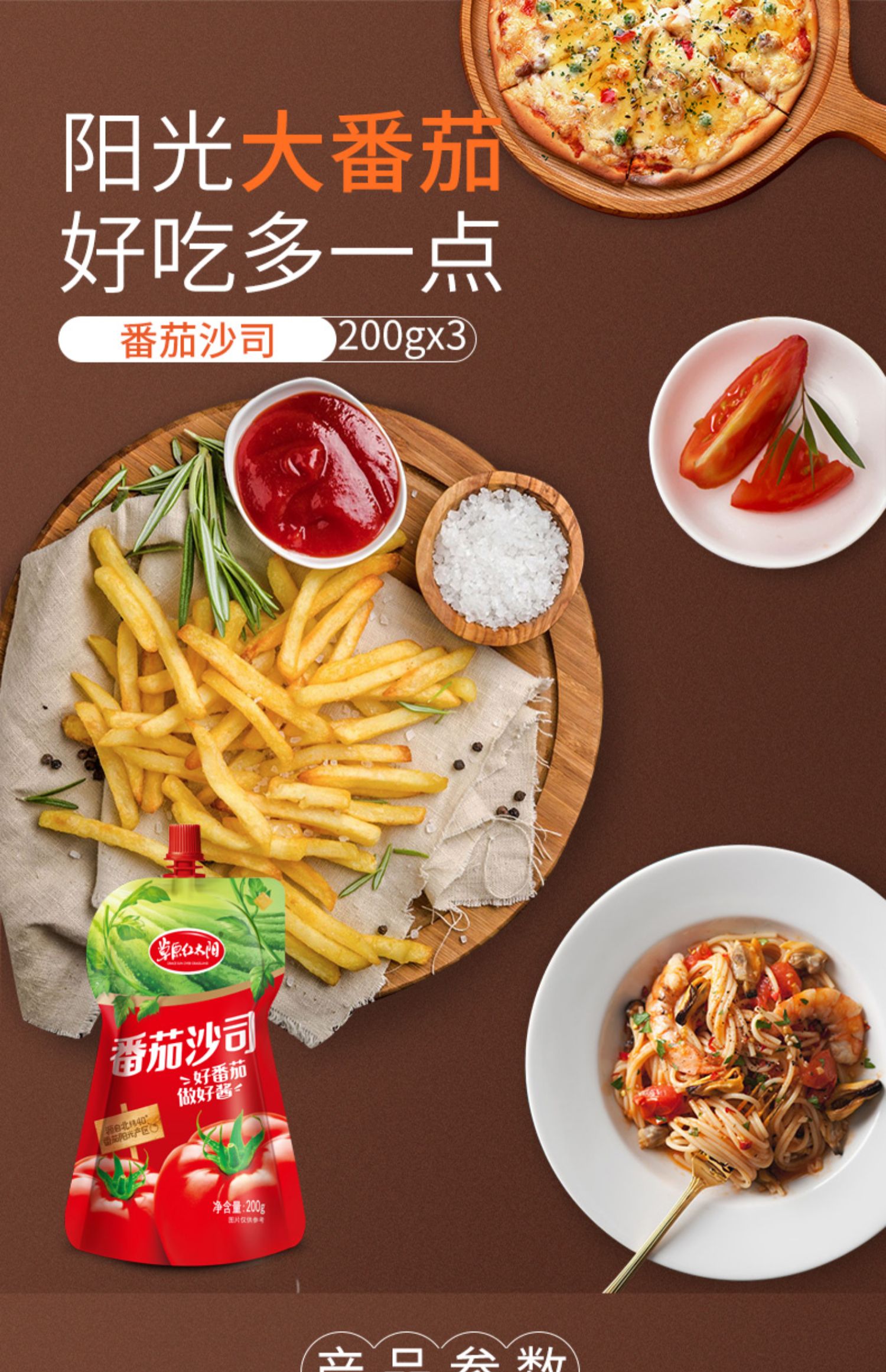 • 商品名称:草原红太阳家用番茄沙司200g*3袋