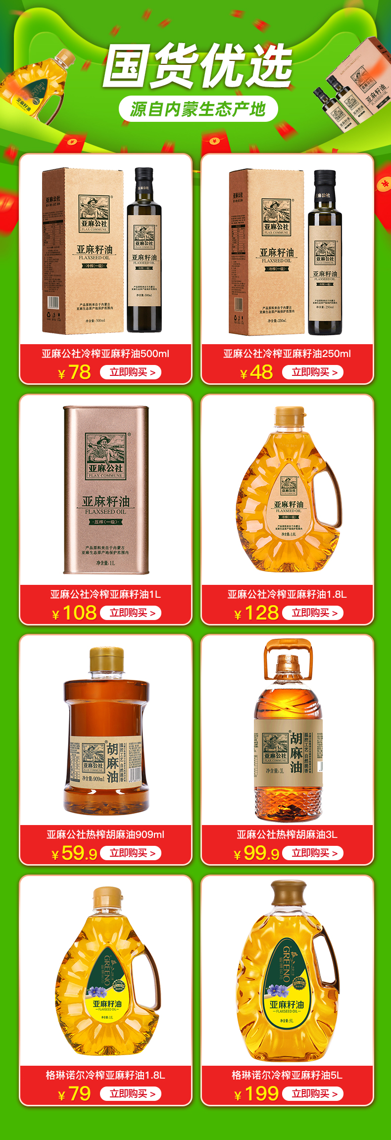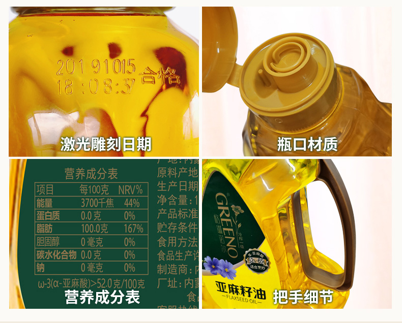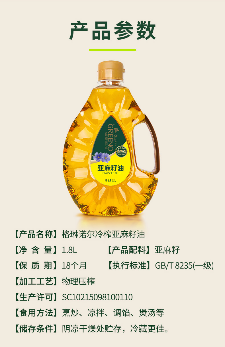 • 商品名称:格琳诺尔冷榨一级亚麻籽油1.8L/桶适合炒菜烹饪食用油商超同款