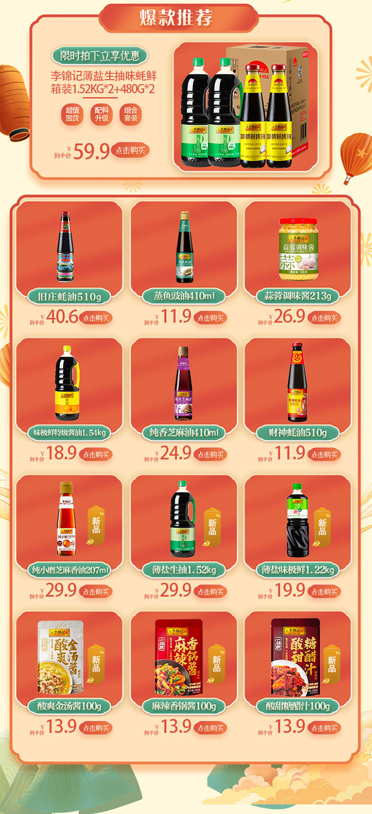 • 商品名称:李锦记薄盐生抽+味蚝鲜箱装1.52kg*2+480g*2升级装生抽蘸炒菜火锅
