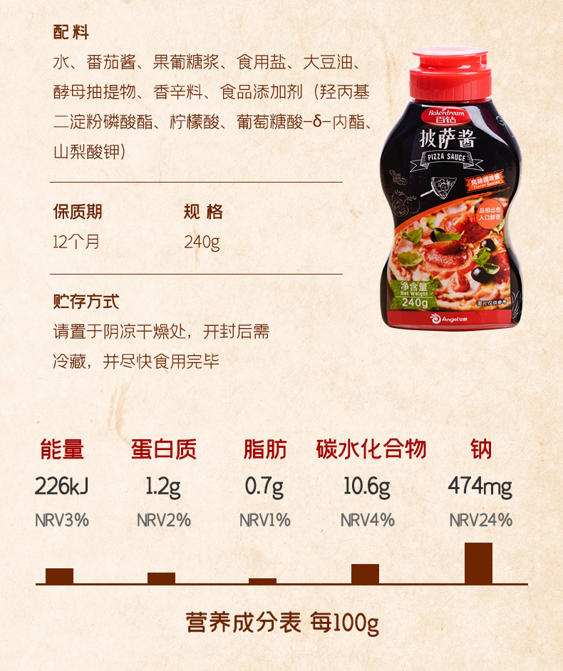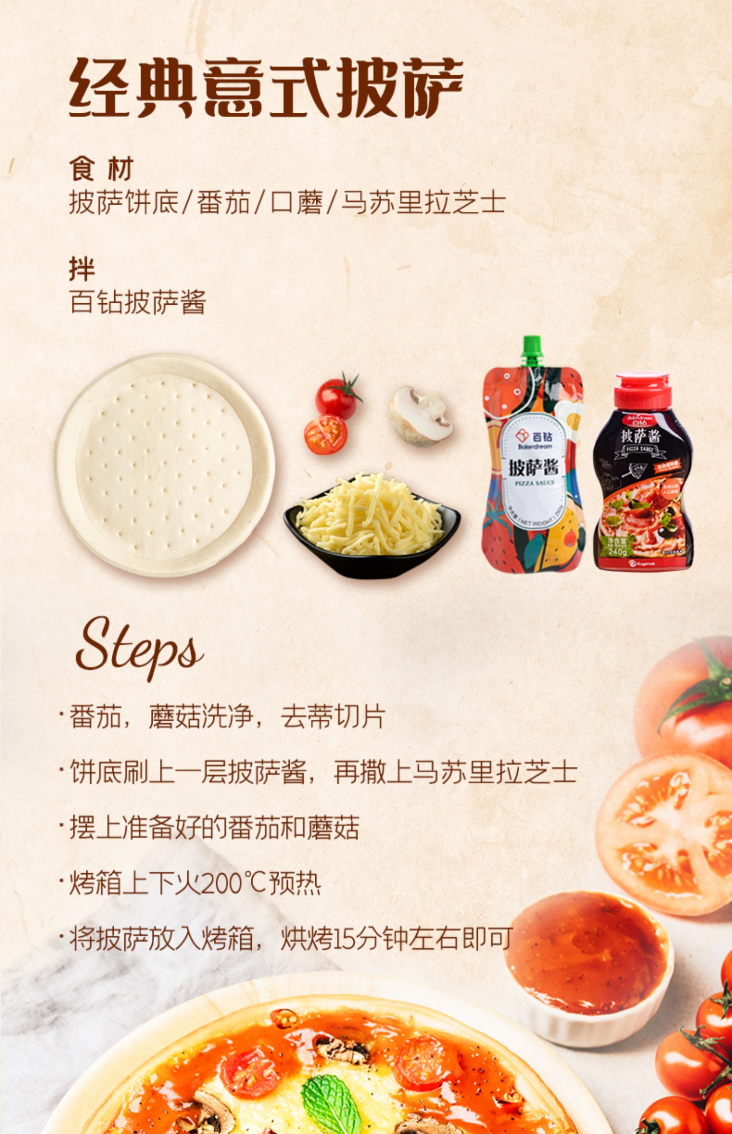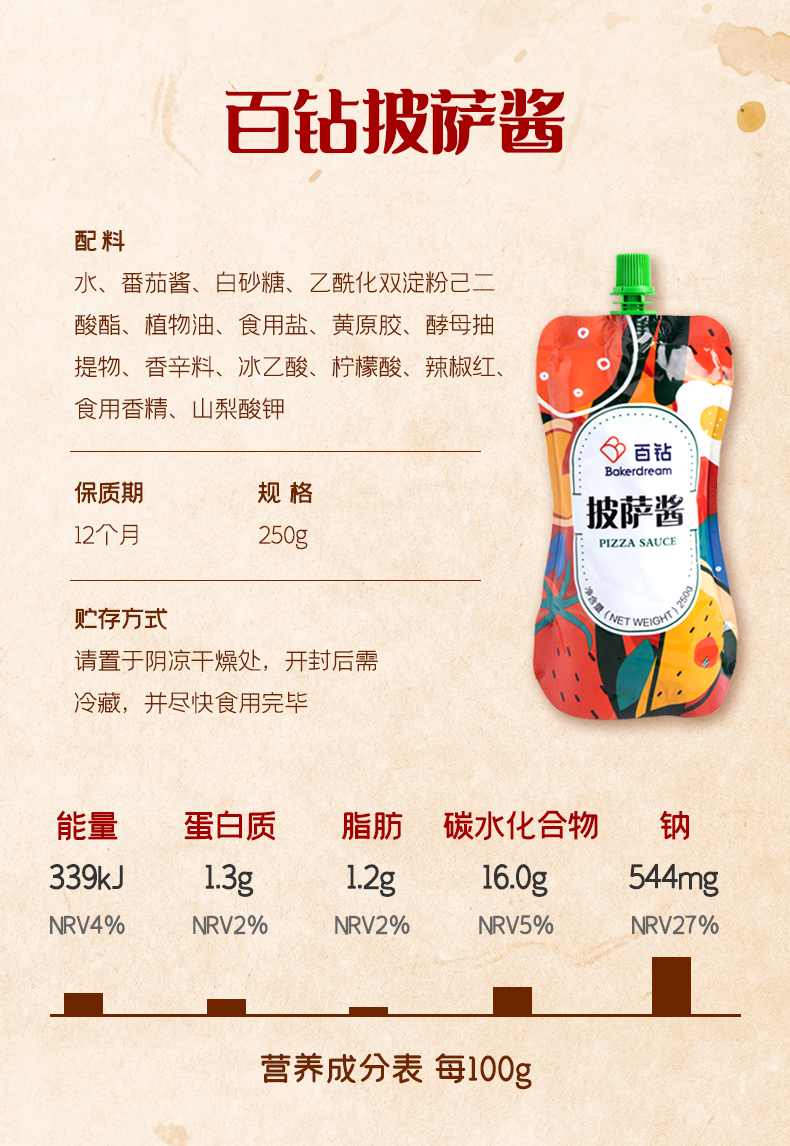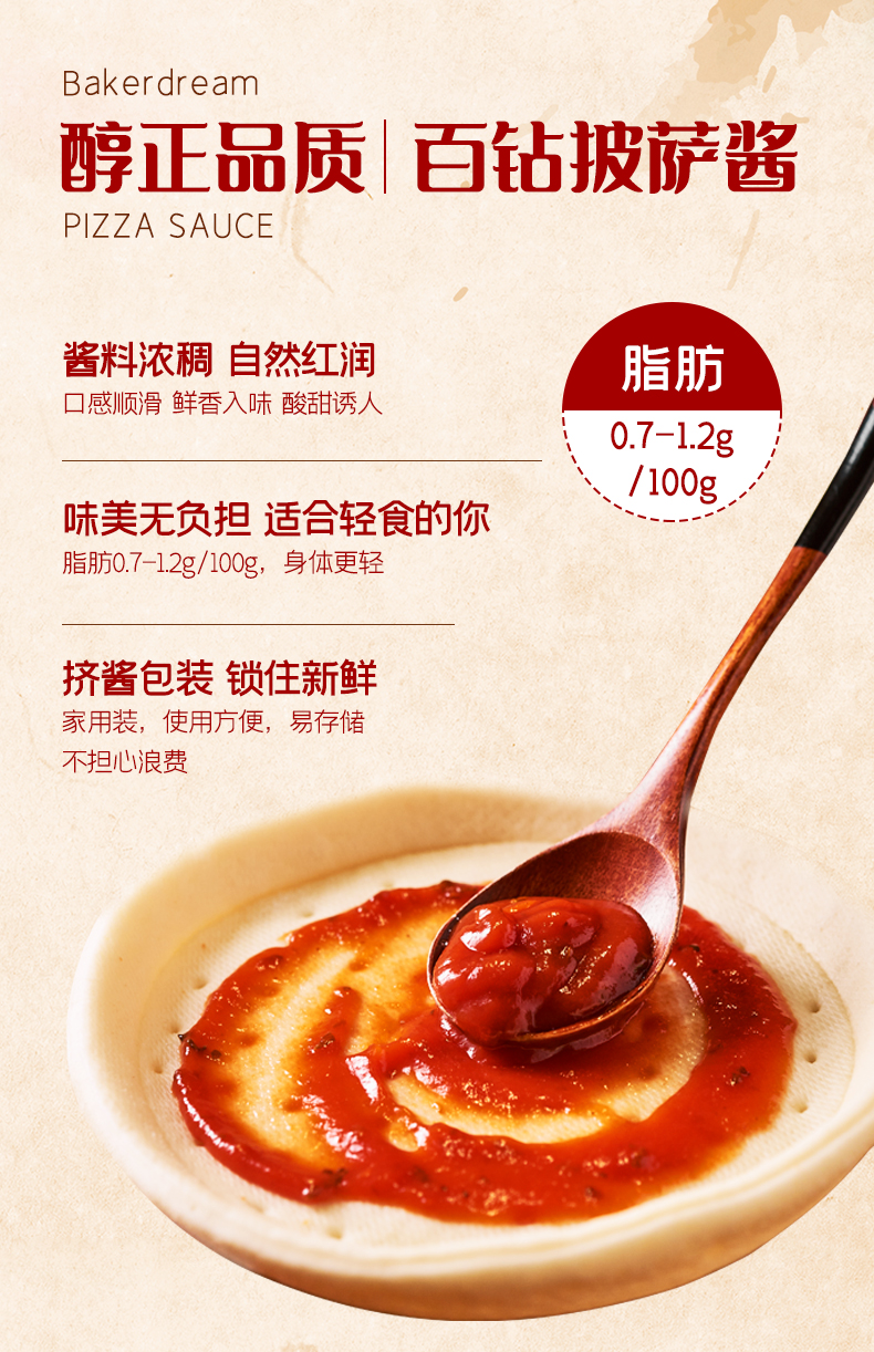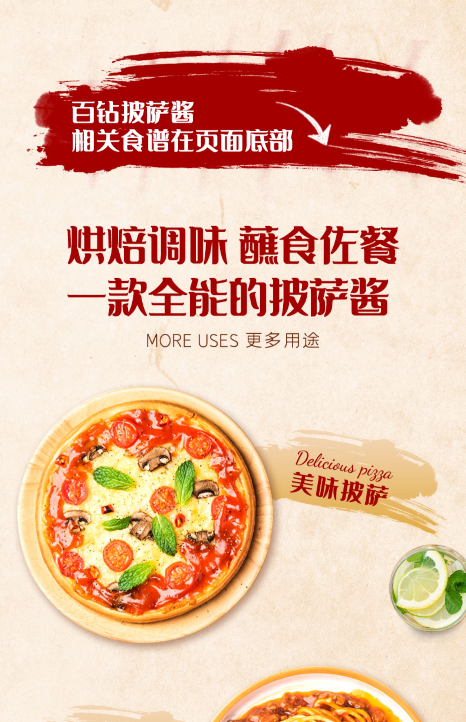 • 商品名称:百钻披萨酱pizza做比萨家用烘焙意大利面手抓饼番茄酱调配料240g