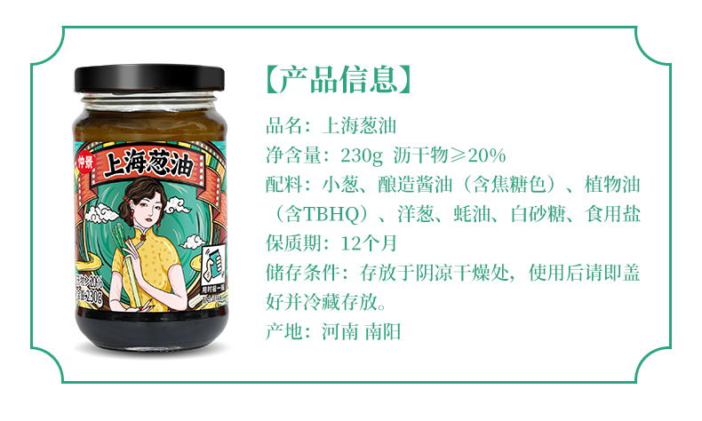 • 商品名称:仲景上海葱油酱230g*2当季小香葱熬制 葱香+酱香 拌面拌饭拌菜